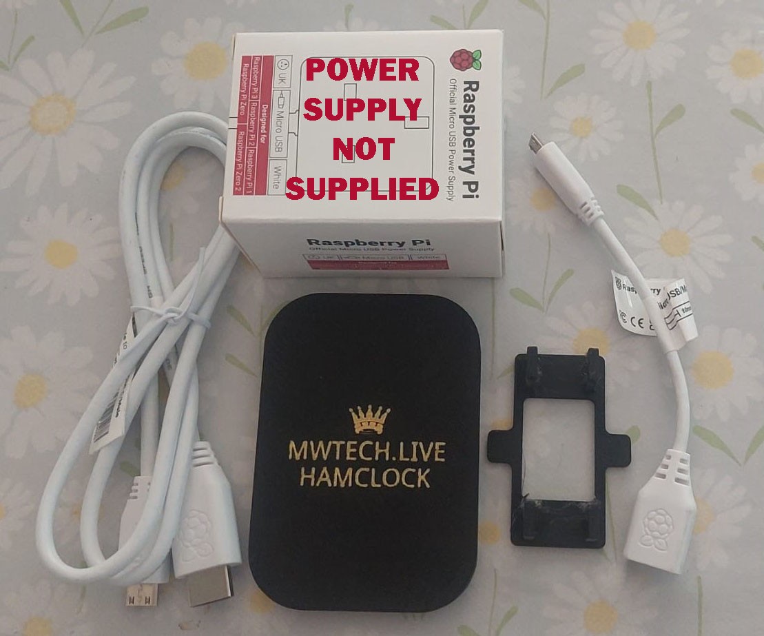 I supply an assembled 3D Printed custom case and a stand, containing a Raspberry pi 2 Zero W Single Board Computer running Raspberry OS with hamclock installed (But not configured with your callsign details etc - see customisation options below on order form)